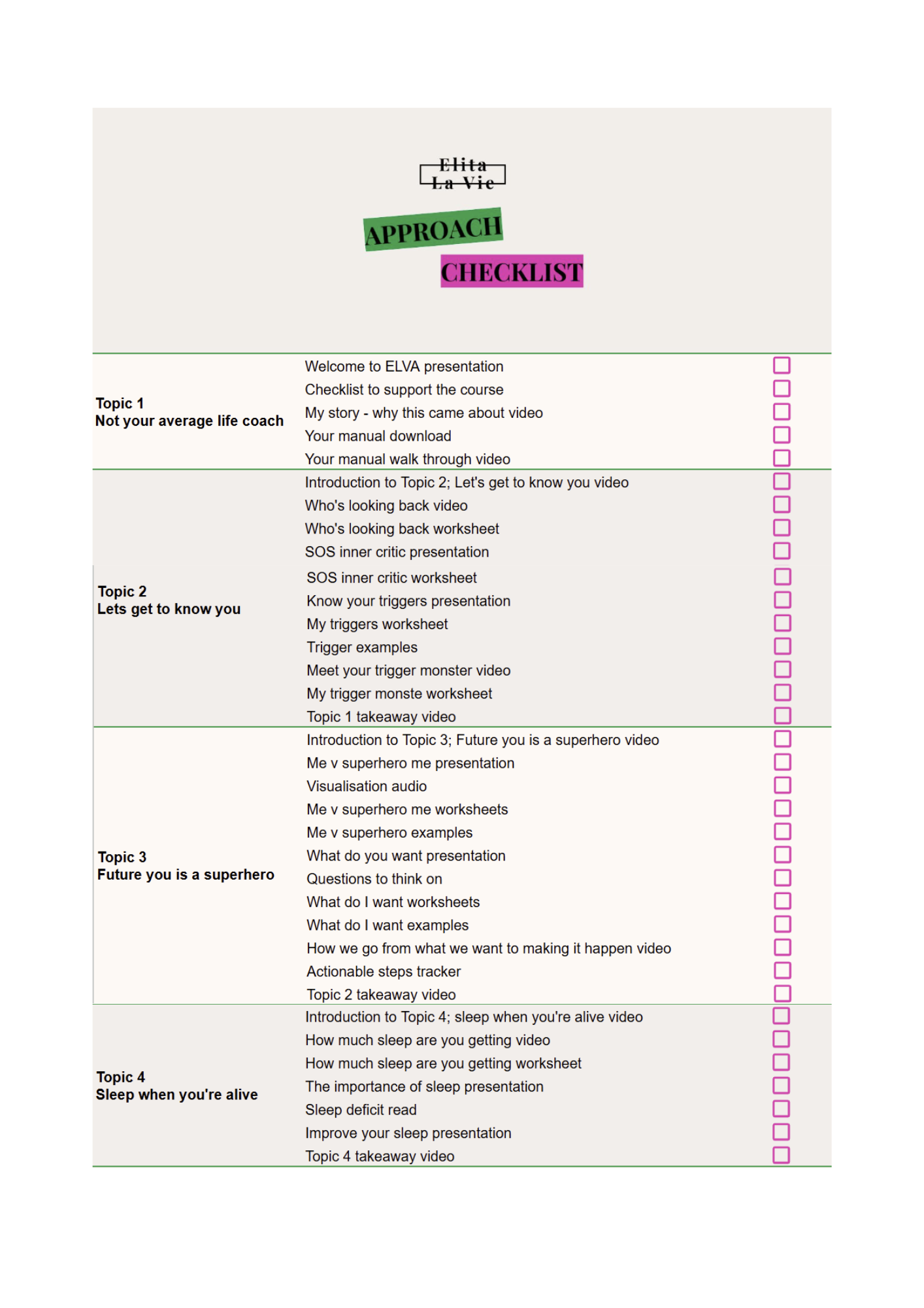 As a massive fan of lists, I have created one listing each item within the approach. Use this to tick off each activity you have completed as you work through the topics.